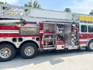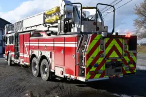 E-One 95′ rear mount aerial platform with aluminum ladder, pre-piped waterway